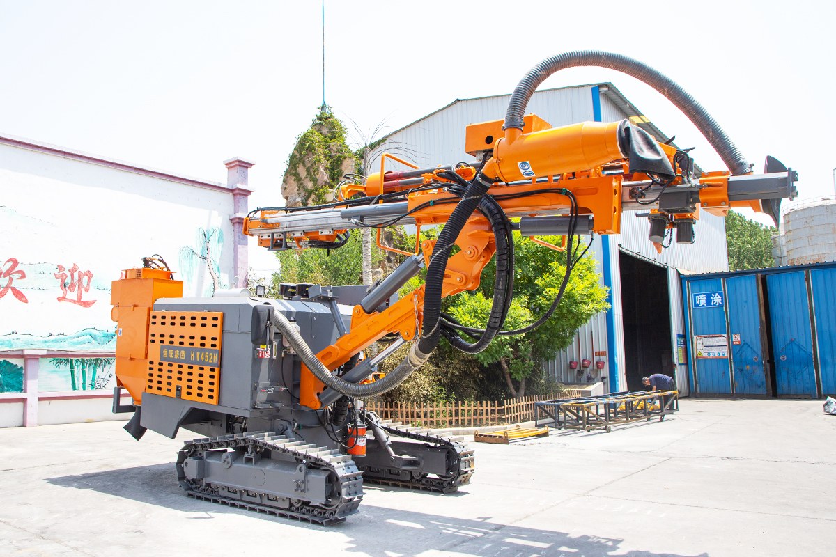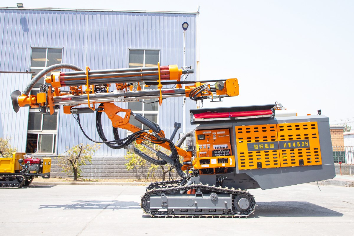 The DTH drilling rig is specifically designed for drilling blast holes in medium to hard rock, with a diameter range of 90-130 mm and a maximum depth of 24 m.