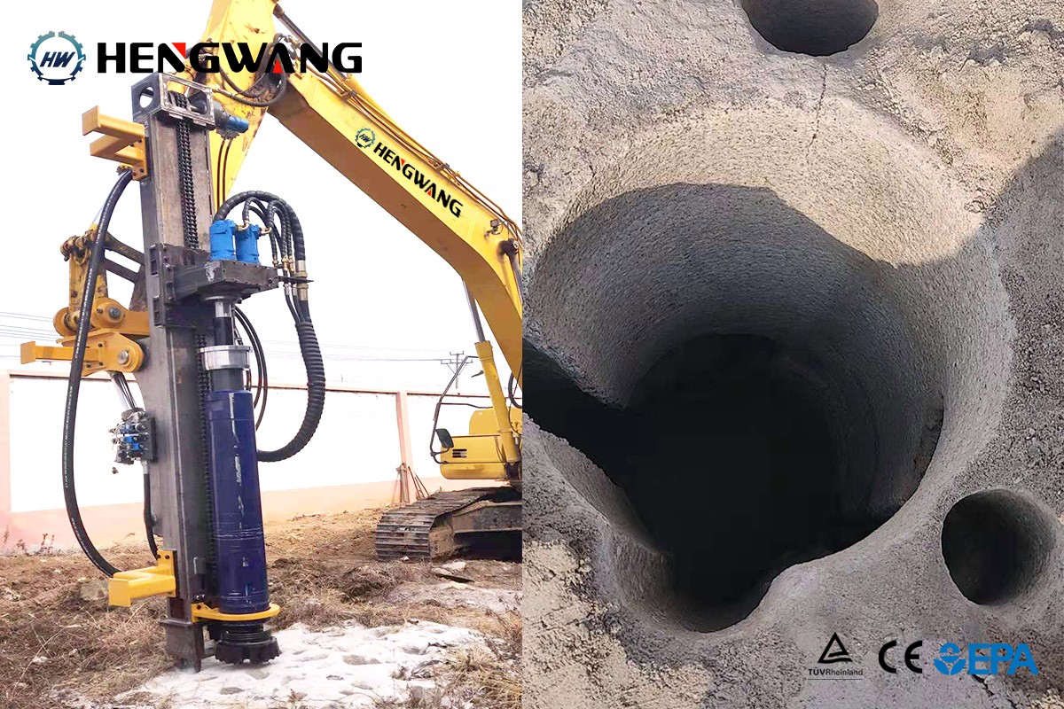 3. The working radius is enlarged. Because the excavator boom is not dismantled, its working radius can be extended by 2-3 meters, and the elevation angle drilling, horizontal drilling and vertical drilling can be realized;