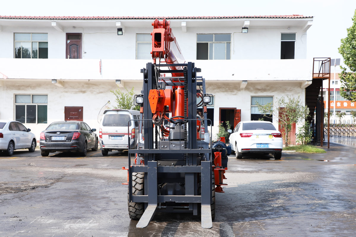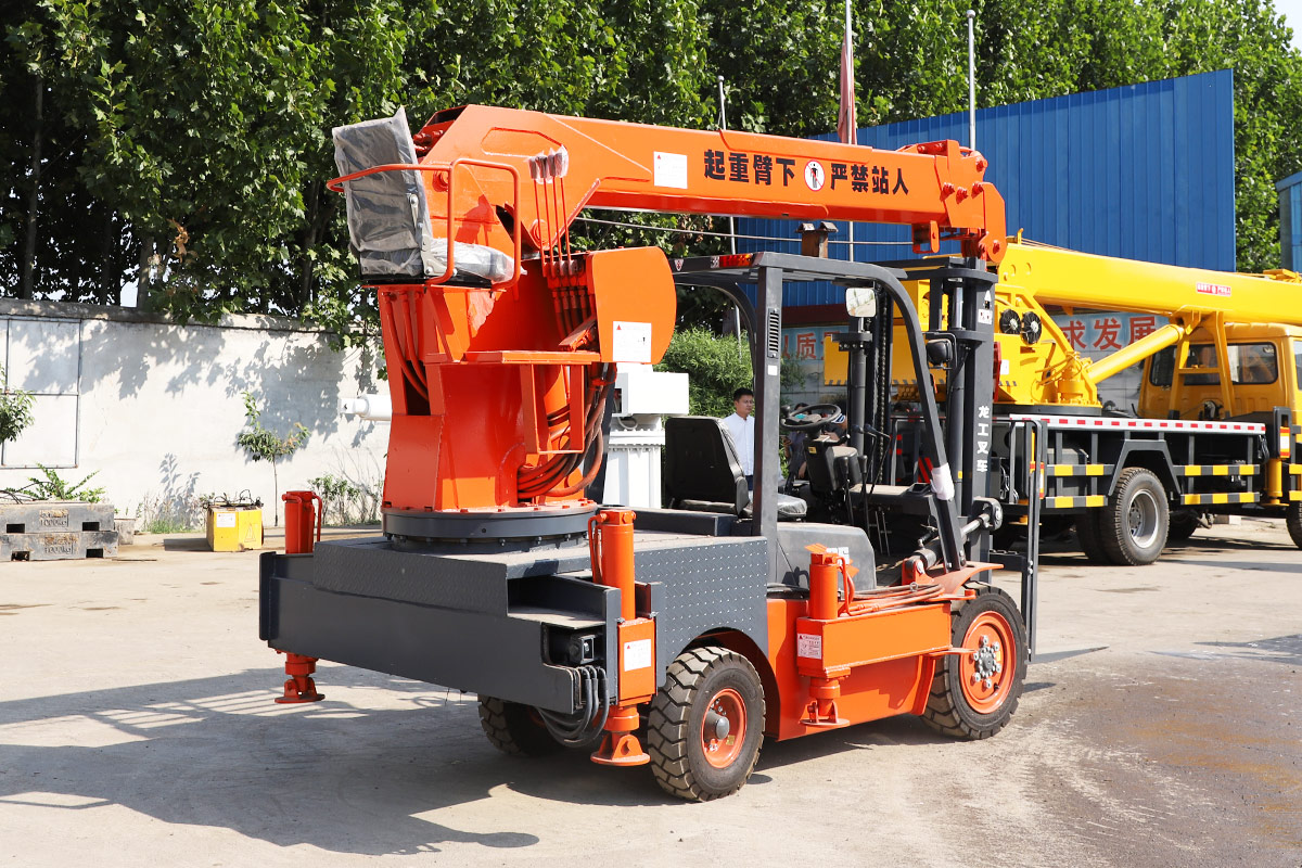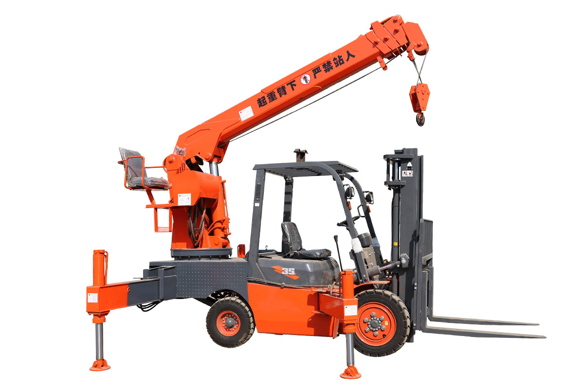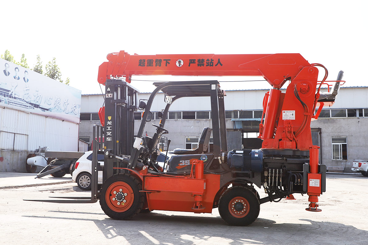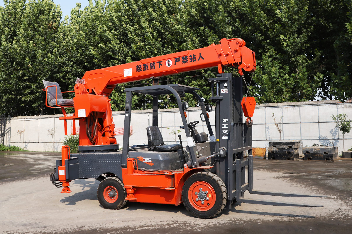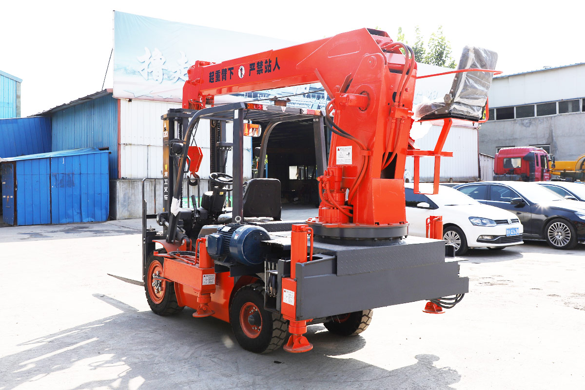 This machine has a forklift in the front and a crane in the back. It is a dual-purpose model that saves time and manpower.